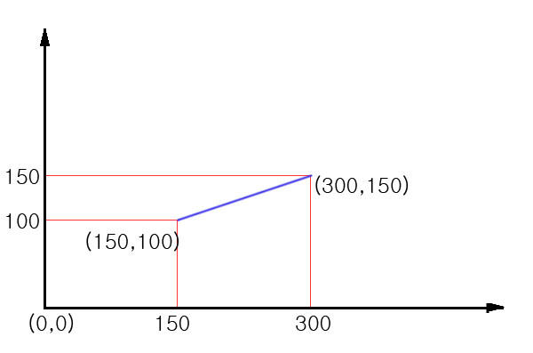 아래 그림에서 파란색 선을 그리기 위해서 첫번째 점의 위치인 150,100의 위치와 300,150의 좌표를 지정해야한다.