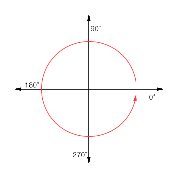 각도는 3시방향을 0˚로 해서 시계 반대방향으로 각도를 정한다.