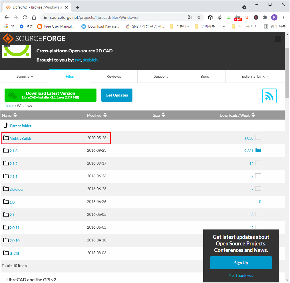 맨 위에 있는 Nightly Builds 폴더에 들어간다. 폴더 이름과 날짜도 그렇고 다운로드 횟수때문에 2.1.3이 가장 최신것인줄 알았는데 이 폴더 안에 최신버전이 있었다.