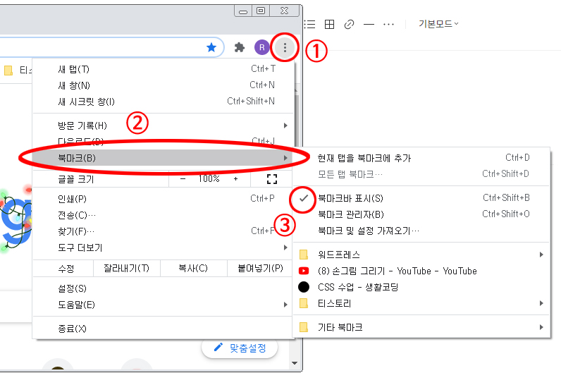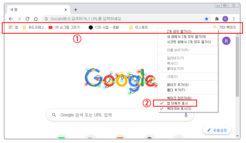 아래 이미지에 ①번 사각형 북마크바 라인 아무곳에서나 마우스 우클릭을 하면 메뉴가 나오는데