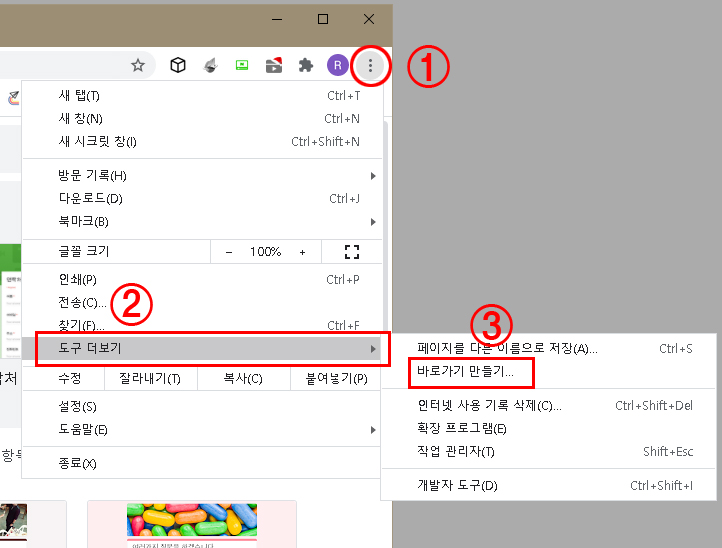 점세개 아이콘 --> 도구더보기 --> 바로가기 만들기