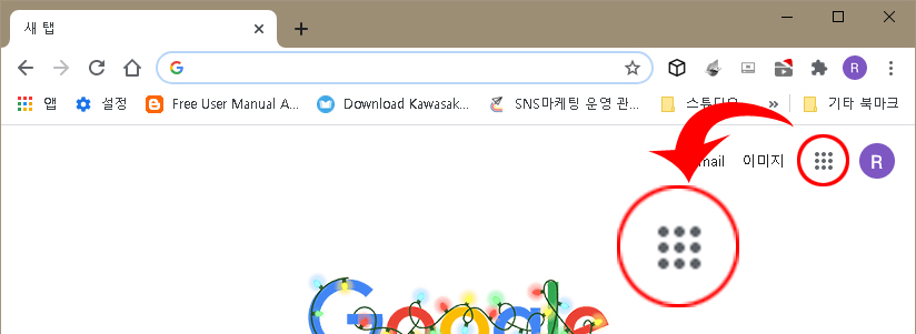 점 아홉개 아이콘은 크롬 메인화면에서만 나오는 구글"사이트" 에서 제공되는 기능이라는 것이다.