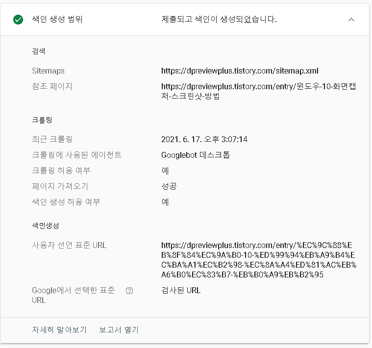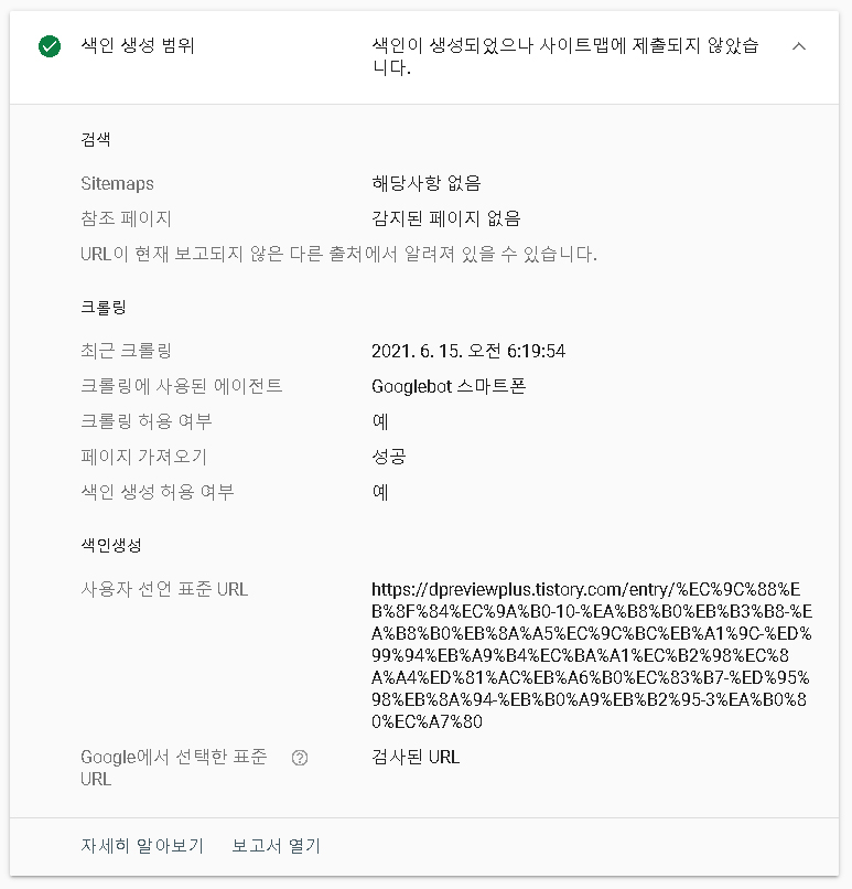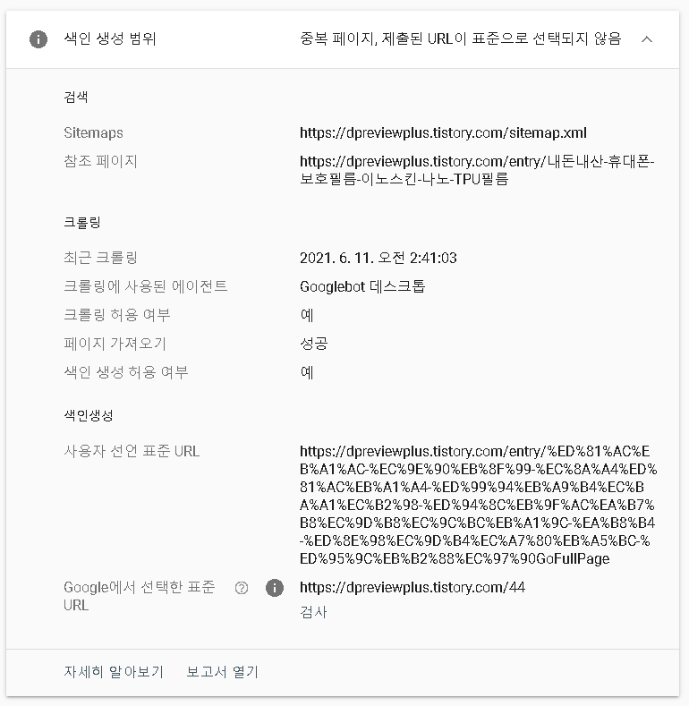 구글에서 선택한 표준이 검사 된 URL이라고 되어있는데 숫자로 검사했으니 숫자 URL이 되는 것이고 사용자 선언 표준 URL을 보면 위의 사진보다 URL이 길다 즉 문자 URL을 수정하기 이전의 좀 긴 URL이다. 두 개를 서로 다른 문서로 판단하는지는 지켜봐야 알 것 같다.